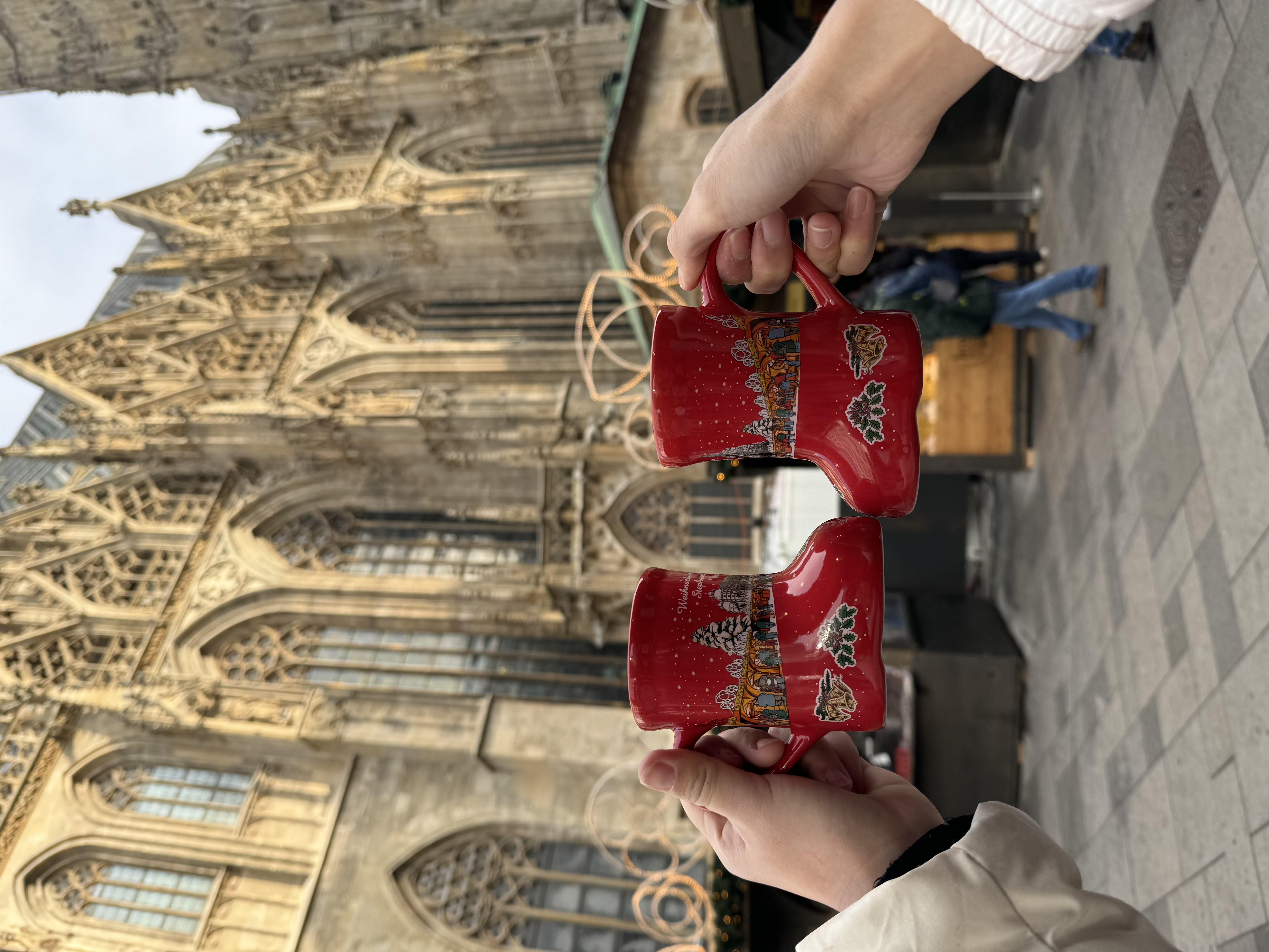 We hunted down the viral "Shoe Mug" at the Christmas Market near the Opernviertel! The Glühwein was €5.40. We also bought some cute handmade stamps at Schwedenplatz.